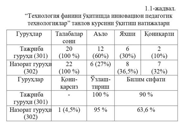 Мазкур курсни ўрганиш самарадорлигини аниқлаш мақсадида институтда таҳсил олаётган технологик таълим таълим йўналиши 301-гуруҳ талабалари тажриба гуруҳи, 302-гуруҳ талабалари эса назорат гуруҳи сифатида танлаб олинди. Ўтказилган тажрибаларда мазкур танлов курси ўтилган гуруҳларда бу тушунча ва маълумотларни талабаларнинг ўзлаштириши ҳамда амалда қўллаши юқори даражада бўлганлиги кузатилди. Олинган натижалар 1.1-жадвалда акс этган. Жадвалдаги маълумотлардан кўринадики, «Технология фанини ўқитишда инновацион педагогик технологиялар» танлов курсини ўрганиш бўйича тажриба гуруҳларида олиб борилаётган ишлар яхши самара бермоқда. Шу сабабли бу ишларни янада кенгайтириш, иложи бўлса мазкур курсни «Технологик таълим» таълим йўналиши ўқув режасининг 4-блокига тегишли бўлган махсус фанлар қаторига киритиш зарур, деб ҳисоблаймиз.