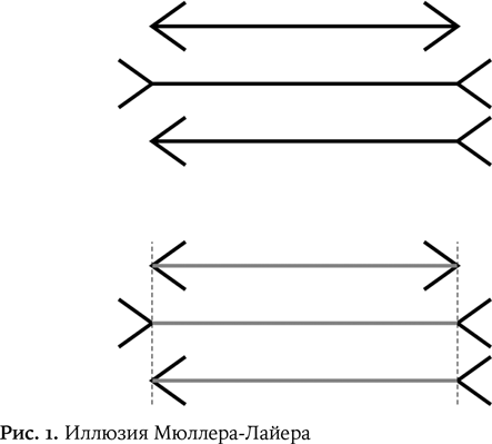 Когда-то науку о мозге очень сильно продвинуло наблюдение за иллюзиями, то есть ошибками восприятия. Вот, например, знаменитая оптическая иллюзия Мюллера-Лайера: если человек видит на бумаге две линии одинаковой длины, но одна кажется ему длиннее, а другая короче из-за пририсованных на концах стрелочек, — это не он сумасшедший, это механизмы зрения заставляют мозг ошибаться (рис. 1). И если мы будем присматриваться к примерам, на которых он ошибается, мы что-нибудь новое про механизмы зрения поймем. Наше знание про слепое пятно на сетчатке и саккады, быстрые движения глаз, в результате которых цельная картинка собирается из обрывков, — прямой результат изучения таких иллюзий.
