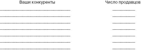 Записали? Хорошо. Теперь запишите общее число прямых конкурентов сюда: ___________. А теперь постарайтесь предположить (если вам неизвестны точные данные), сколько продавцов работает у каждого из этих конкурентов. Совет: считайте всех, кто продает продукт конкурента, а не только тех, кто называется продавцом. Вернитесь к нашей таблице и в отведенных местах проставьте соответствующие цифры.