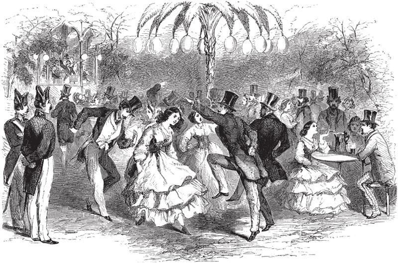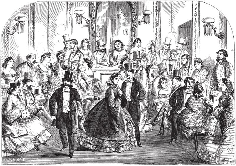 Если пройти через бар питейного заведения, вы подниметесь по ступеням и окажетесь в хорошо освещенной газовыми рожками длинной комнате. В ней вдоль стен стоят лавки, чтобы танцующие могли отдохнуть, и вы не сможете не заметить оркестр, который вполне достоин внимания. В большинстве случаев он состоит из четырех музыкантов, бородатых и на вид лохматых иностранцев, возможно немцев, которые играют на скрипке, корнете и двух дудках или флейтах. Оркестр обычно располагается в углу зала на возвышении, к которому ведут две ступени. Спереди оно обшито досками, оставлена лишь небольшая дверь с одного конца для исполнителей, для удобства которых ставят скамью или стулья. Там есть небольшая полочка, на которую кладут инструменты. Часто ее украшают оловянные кружки. Сама музыка просто замечательная, во всяком случае, в высшей степени бодрящая. Пронзительные звуки дудок и резкие – трубы, издаваемые в быстром темпе, возбуждают танцующих, пока они не закружатся в вальсе с огромной скоростью.