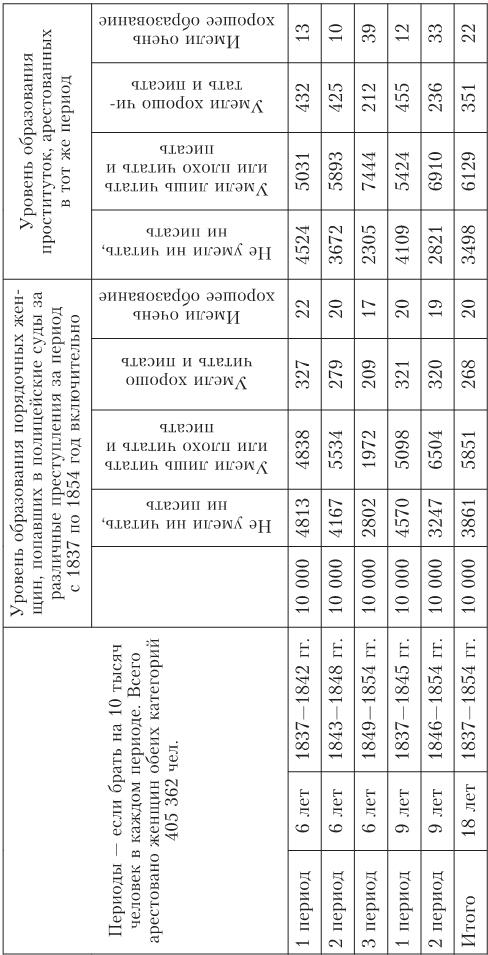 Эта таблица показывает, что публичные женщины немного менее безграмотны, чем те, которые вместе с ними образуют самую позорную часть населения. Но следует помнить, что это едва ли является точным мерилом оценки образовательного уровня всех проституток или проституток как категории населения, потому что мы лишь взяли тех, кто был арестован за какое-нибудь преступление или правонарушение. Так что мы можем справедливо предположить, что они были самыми худшими из себе подобных во всех отношениях.
