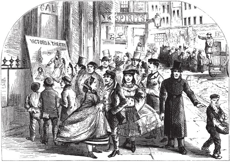 Недавно приведенный в порядок и отреставрированный театр «Эрл Эффингем» на Уайтчепел-Роуд вмещает три тысячи человек. В нем нет лож, так как у них не было бы постоянных посетителей, если бы они существовали. Жители Уайтчепела не ходят на спектакли в лайковых перчатках и белых галстуках. Сцена этого театра просторная и просто отличная; в нем есть обширная база для спецэффектов, так как в Уайтчепеле очень любят пиротехнические шоу, синих, красных духов и дьявола, исчезающего в облаке дыма через незаметное отверстие в полу. Громкими аплодисментами встречают прозрачных нимф, когда они, как Афродита, выходят из волн морских и садятся на мнимые солнечные лучи, висящие между сценой и театральными небесами.