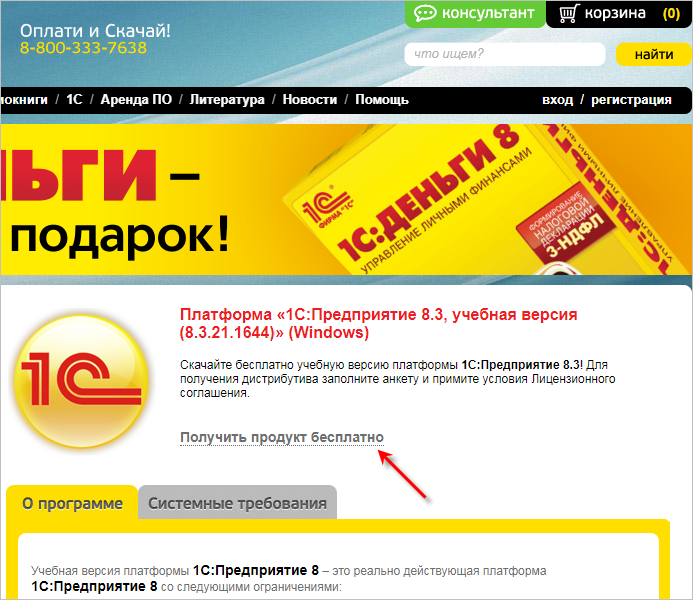 Чтобы скачать учебную платформу «1С:Предприятие» версии 8.3.21, перейдите по адресу https://online.1c.ru/catalog/free/34499722/ и нажмите Получить продукт бесплатно (рис. 0.1).