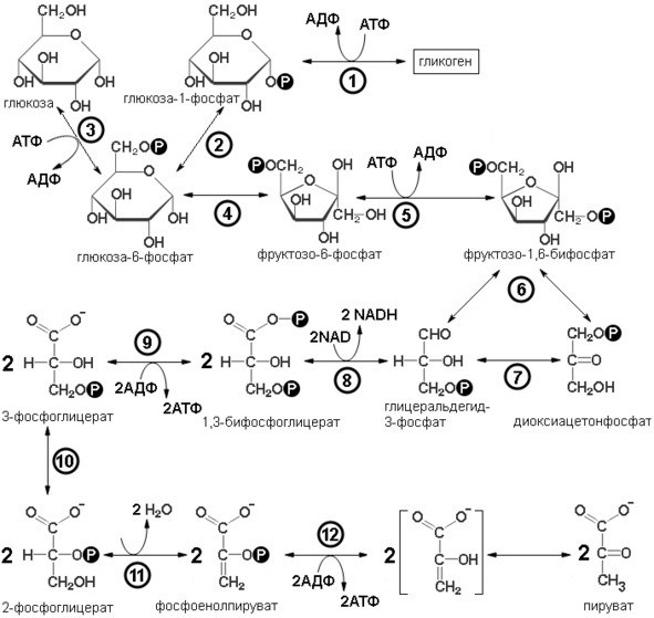 Рисунок 1: Схема реакций гликолиза, цифрами в кружках названия ферментов. 1 – гликогенфосфорилаза; 2-глюкозофосфатизомераза; 3 – гексокиназа (глюкокиназа в печени); 4 – глюкозо-6-фосфатизомераза; 5 – фосфофруктокиназа; 6 – альдолаза; 7 – триозофосфатизомераза; 8 – глицероальдегид-3-фосфат оксидоредуктаза фосфорилирующая; 9 – 1,3-бифосфоглицераткиназа; 10 – фосфоглицератизомераза; 11 – енолаза; 12 – пируваткиназа (черный круг с буквой Р в центре обозначает фосфатную группу).