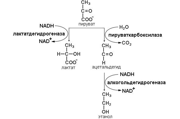 У дрожжей и у других микроорганизмов, сбраживающих глюкозу не до лактата, а до этанола и СО2, путь ферментативного расщепления глюкозы совпадает с описанным выше для анаэробного гликолиза на всем протяжении, за исключением этапа, катализируемого лактатдегидрогеназой (схема представлена на рисунке 3). В дрожжевых клетках, которые не содержат фермента, аналогичного лактатдегидрогеназе мышечной ткани, этот этап заменен двумя другими реакциями. В первой из них продукт расщепления глюкозы пируват теряет свою карбоксильную группу под действием пируватдекарбоксилазы. Эта реакция представляет собой простое декарбоксилирование; реального окисления пирувата при этом не происходит. Для проявления каталитической активности пируватдекарбоксилазе требуется Mg2+. С молекулой этого фермента прочно связан кофермент тиаминпирофосфат. На последнем этапе спиртового брожения ацетальдегид восстанавливается до этанола за счет NADH, образовавшегося при окислении глицеральдегид-3-фосфата; эта реакция катализируется алкогольдегидрогеназой.