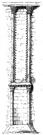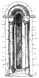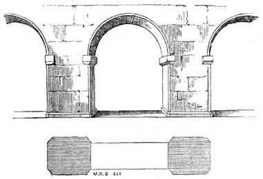 But independent of examples afforded by some few ancient Roman churches, and such of the temples and public buildings of the Romans as were then remaining in Britain, the Saxon converts were directed and assisted in the science of architecture by those missionaries from Rome who propagated Christianity amongst them; and during the Saxon dynasty architects and workmen were frequently procured from abroad, to plan and raise ecclesiastical structures. The Anglo-Saxon churches were, however, rudely built, and, as far as can be ascertained, with some few exceptions, were of no great dimensions and almost entirely devoid of ornamental mouldings, though in some instances decorative sculpture and mouldings are to be met with; but in the repeated incursions of the Danes, in the ninth and tenth centuries, so general was the destruction of the monasteries and churches, which, when the country became tranquil, were rebuilt by the Normans, that we have, in fact, comparatively few churches existing which we may reasonably presume, or really know, to have been erected in an Anglo-Saxon age. Many of the earlier writers on this subject have, however, caused much confusion by applying the term ‘Saxon’ to all churches and other edifices contradistinguished from the pointed style by semicircular-headed doorways, windows, and arches. But the vestiges of Anglo-Saxon architecture have been as yet so little studied or known, as to render it difficult to point out, either generally or in detail, in what their peculiarities consist: the style may, however, be said to have approximated in appearance much nearer to the Debased Roman style of masonry than the Norman, and to have been also much ruder: and in the most ancient churches, as in that at Dover Castle, and that at Bricksworth, we find arches constructed of flat bricks or tiles, set edgewise, which was also a Roman fashion. The masonry was chiefly composed of rubble, with ashlar or squared blocks of stone at the angles, disposed in courses in a peculiar manner.