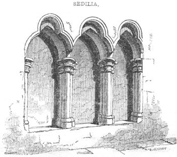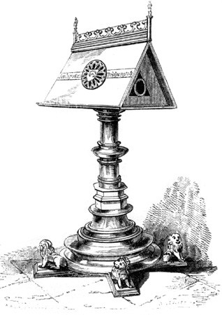 sunk in the face.Outside the roof of some churches, on the apex of the eastern gable of the nave, is a small open arch or turret, in which formerly a single bell was suspended: this was the sanctus or sacringe bell, thus placed that, being near the altar, it might be the more readily rung, when, in concluding the ordinary of the mass, the priest pronounced the Ter-sanctus, to draw attention to that more solemn office, the canon of the mass, which he was now about to commence; it was also rung at a subsequent part of the service, on the elevation and adoration of the host and chalice, after consecration171-*; but though the arch remains on the gable of the nave of many churches, the bell thus suspended is retained in few; amongst which may be mentioned those of Long Compton, Whichford, and Brailes, in Warwickshire, where this bell is still preserved hung in an arch at the apex of the nave, with the rope hanging down between the chancel and nave171-†. Mention of this bell is thus made in the Survey of the Priory of Sandwell, in the county of Stafford, taken at the time of the Reformation: “Itm the belframe standyng betw: the chauncell and the church, wt. a litle sanctm bell in the same.” Generally, however, a small hand-bell was carried and rung at the proper times in the service, by the acolyte; and in inventories of ancient church furniture we find it often noticed as “a sacringe bell;” but in an inventory of goods belonging to the chapel of Thorp, Northamptonshire, it is described as “a litle sanctus bell.” A small sacringe bell, of bell-metal, with the exception of the clapper, which was of iron, was in 1819 discovered on the removal of some rubbish from the ruins of St. Margaret’s Priory, Barnstable; and within the last few years a small sanctus bell was found on the site of a religious house at Warwick172-*.
