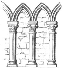 When the original Norman style of building was first broken through, by the introduction of the pointed arch, which was often formed by the intersection of semicircular arches, the facing of it, or architrave, was often ornamented with the zig-zag, billet, and other mouldings, in the same manner as the Norman semicircular arches: it also rested on round massive piers, and still retained many other features of Norman architecture. But from the time of its introduction to the close of the twelfth century, the pointed arch was gradually struggling with the semicircular arch for the mastery, and with success; for from the commencement of the thirteenth century, as nearly as can be ascertained, the style of building with semicircular arches was, with very few exceptions, altogether discarded, and superseded by its more elegant rival.