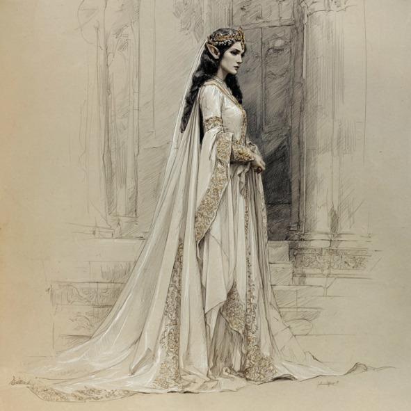 Невеста, Илвинда, была воплощением сияющей радости. Ее кремовое платье, расшитое по лифу, пышным рукавам и длинному шлейфу сложнейшим золотым узором, казалось, соткано из света. На голове сверкала тиара из жемчуга и белого золота, а к волосам крепилась длинная фата, струившаяся до самого пола. Но главным украшением Илвинды была ее улыбка — широкая, искренняя, счастливая, с которой она встречала гостей рядом со своим супругом, третьим сыном короля Вальмиры Эиларио. Они выглядели не королевскими отпрысками, а влюбленными подростками, затеявшими игру в свадьбу для своих друзей. Серьезность момента выдавал лишь статус гостей — высшие сановники Британии, влиятельные дворяне, богатейшие промышленники и мастера-ремесленники, известные творческие личности, а также важные персоны из мира людей.