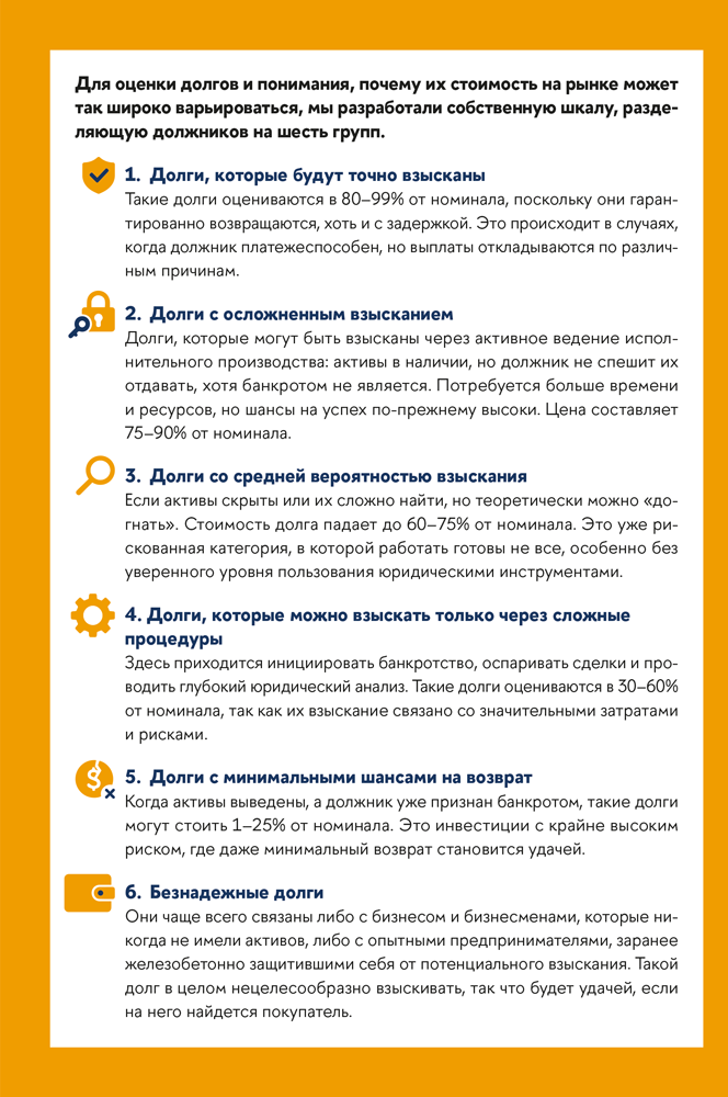 Только в тот момент (а это было в 2018 году) я наконец понял, как работает рынок долгов, сколько и что тут стоит, а также сформулировал ответ на вопрос, который поставил перед собой в 2014 году: «Что делать кредитору, если его должник формально не обладает имуществом, но фактически имеет ресурсы для погашения долга?»