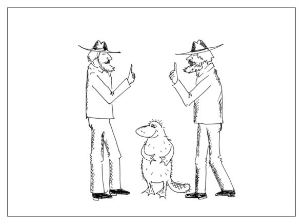 Один раз пришли к реке дяденьки-зоологи и увидели Утконоса. И стали думать, кто это. Один сказал, что это бобёр. Другой заспорил, что вовсе никакой не бобер, а птица. Первый сказал, что какая птица, если у него нет крыльев. А второй сказал, что какой бобёр, если у него клюв. Они очень между собой спорили и никак не могли прийти к общему мнению.