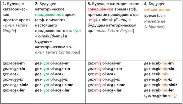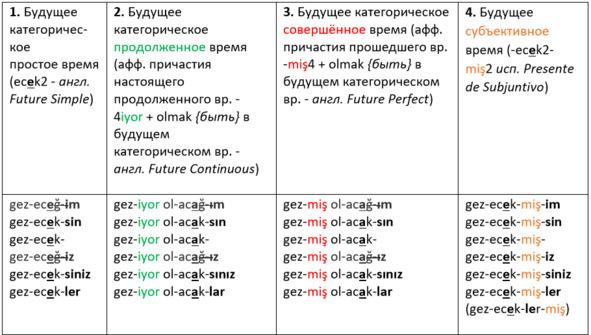 1. Группа будущих времён (1-й тип времён — личные аффиксы, как в настоящем продолженном вр.)