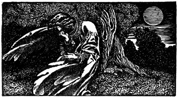 Then in that gloomy light the Lady Elaine came and kneeled down beside the couch whereon he lay and looked down into Sir Launcelot's face and she studied his face as though it were a book written very fine and small; and ever her breath came more and more quickly as it would suffocate her, for she felt assured that this was indeed Sir Launcelot. And anon she took Sir Launcelot's hand, all thin with famine and as cold as ice, and she looked at it and she beheld a ring upon the finger and the ring was set with a clear blue stone, and thereupon the Lady Elaine knew that this was the ring which the Lady of the Lake had given Sir Launcelot aforetime.