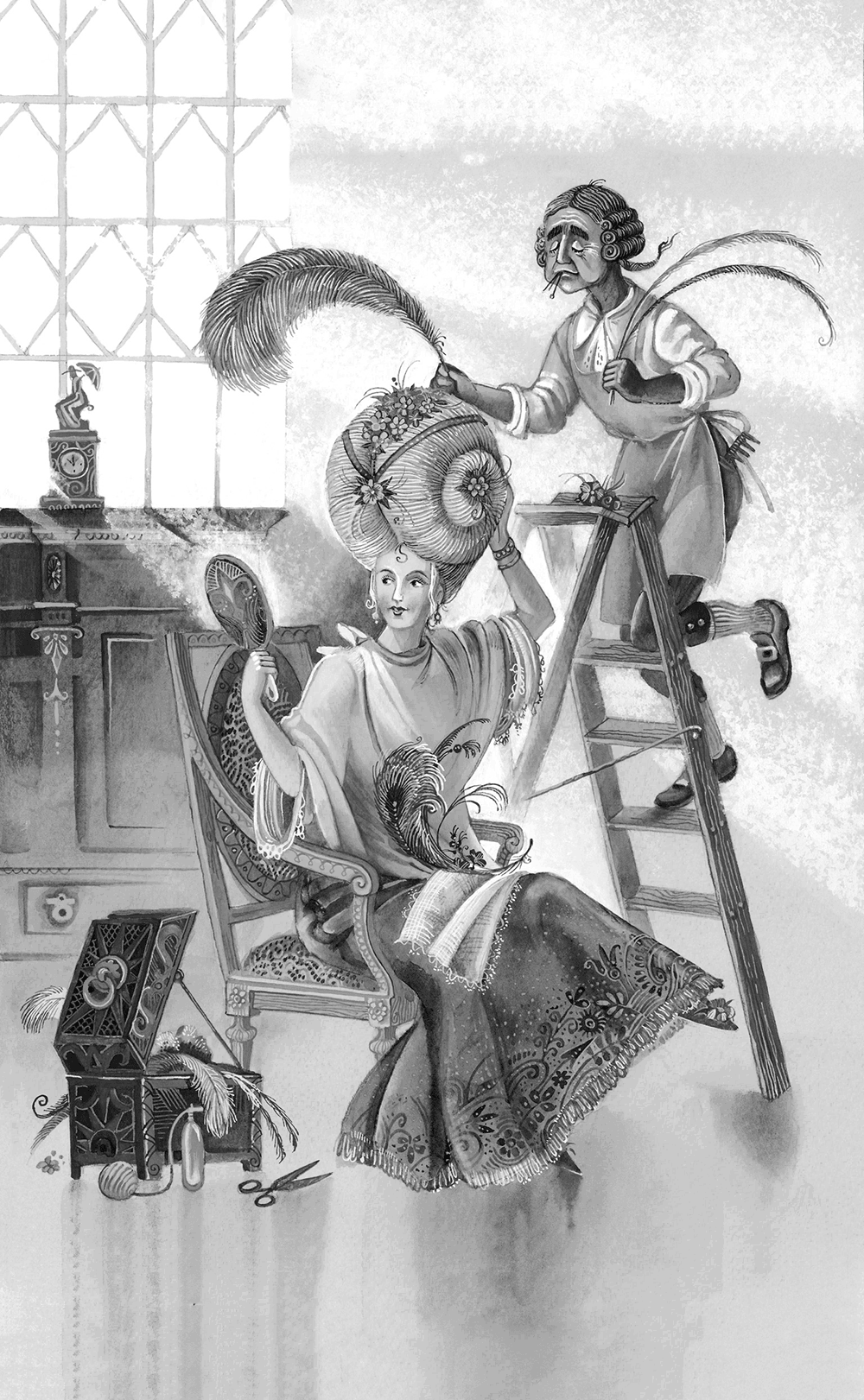 Потом принялся за супругу его, напомадил и напудрил у неё локоны и шиньон[11] и взгромоздил на её голове целую оранжерею[12] разных цветов, между которыми блистали искусным образом помещённые два бриллиантовых перстня, когда-то подаренные мужу её родителями учеников. По окончании головного убора накинула она на себя старый, изношенный салоп[13] и отправилась хлопотать по хозяйству, наблюдая при том строго, чтоб как-нибудь не испортилась причёска; и для того сама она не входила в кухню, а давала приказания своей кухарке, стоя в дверях. В необходимых же случаях посылала туда мужа своего, у которого причёска не так была высока.