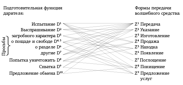 2) Все другие формы передачи и получения, связанные со всеми другими подготовляющими формами. Просьба о разделе относится ко второму типу, если раздел действительно производится, но к первому — если спорщики обманываются. Далее можно заметить, что находка, покупка и внезапное самостоятельное появление волшебного средства или помощника чаще всего встречаются без всякой подготовки. Это рудиментарные формы. Но если они все же подготовляются, то в формах второго типа, а не первого. В связи с этим может быть затронут вопрос о характере дарителей. Второй тип чаще всего дает дружественных дарителей (за исключением тех, которые отдают волшебное средство поневоле, после драки), первый тип дает дарителей враждебных или, во всяком случае, обманутых. Это уже не дарители в собственном смысле слова, а персонажи, снабжающие героев поневоле. Внутри форм каждого типа все соединения возможны и логичны, хотя бы они и отсутствовали. Так, например, испытующий или благодарный даритель может средство передать, указать, продать, изготовить, может дать герою найти его и т. д. С другой стороны, у обманутого дарителя средство может только похищаться или отниматься. Вне этих типов соединения нелогичны. Так, например, нелогично, если герой, исполнив трудную задачу яги, затем похищает у нее жеребенка. Это не значит, что таких соединений в сказке нет. Они есть, но рассказчик в таких случаях старается дополнительно мотивировать поступки своих героев. Другой образец нелогичной связи, очень прозрачно мотивированной: Иван бьется со стариком. Нечаянно во время боя старик дает Ивану испить сильной воды. Это «нечаянно» становится понятным, если сравнить этот случай с теми сказками, где напиток дается благодарным или, вообще, дружественным дарителем. Таким образом, мы видим, что нелогичность связи сказочника не останавливает. Если идти чисто эмпирическим путем, то придется утверждать заменяемость всех разновидностей элементов Д и Z относительно друг друга.