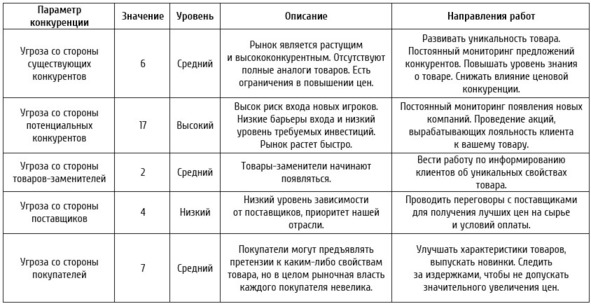 После того, как все пять сил конкуренции получили оценки, данные сводятся в таблицу. Оценки по каждой силе суммируются. Таблица показывает, какие угрозы конкуренции являются наиболее сильными на момент анализа. Намеченные мероприятия помогают компании делать на рынке осознанные шаги, а не хвататься за что попало. Файл для анализа конкуренции доступен по ссылке bit.ly/simplemarketing-2. Пример заполнения таблицы для рынка тортов: