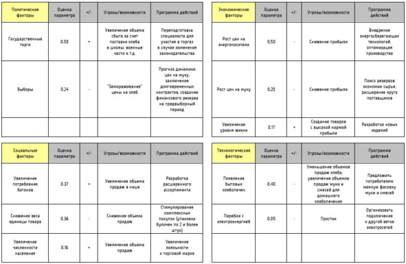 Результаты анализа макросреды оформляются в виде матрицы. На рисунке пример для рынка хлеба.