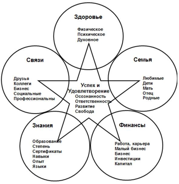 • Проставьте по каждой из сфер баллы от 0 до 10, которые характеризуют вашу удовлетворенность данной областью: здоровье, финансы, любовь, связи, знания.