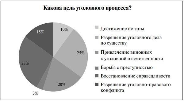 Идея установления разрешения уголовно-правового конфликта в качестве цели уголовного процесса не нова. Об этом свидетельствуют как диссертационные исследования, монографии, так и отдельные публикации, в которых не только в содержании, но и в наименовании содержится соответствующая формулировка. Здесь можно назвать работы Л. В. Головко20, А. А. Брыжинского21, Е. В. Попаденко22, Ю. В. Кувалдиной23, М. А. Лавнова24 и др. При всем этом о концепции стимулирования уголовно-процессуального сотрудничества с целью разрешения уголовно-правового конфликта не упоминалось. Более того, никем такая цель не ставилась целью в целом уголовно-процессуального сотрудничества. С одной стороны, это подтверждает научную новизну и придает значимость авторским идеям, с другой — усложняет научный поиск, заставляя пробираться к истине через руины смежных проблем. Следует заметить, что 15% правоприменителей, участвовавших в опросе, то ли интуитивно, то ли умышленно указали, что целью уголовного процесса является разрешение уголовно-правового конфликта.