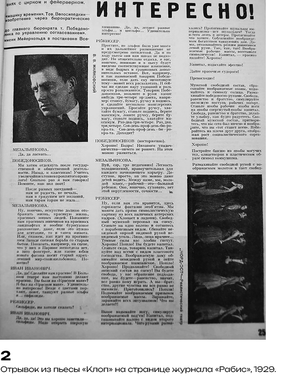 Затем товарищ не понял. Я не говорю, что я отказываюсь от традиции «Клопа». Наоборот, я все время держусь ее. Для меня было бы единственной критикой, если бы мне сказали, что это не подходит для нас, для Советского Союза, — но это надо проверить. Если не доходит — нужно убрать. Если доходит — в десять раз увеличить. Так что тут возражать товарищу не приходится, несмотря на то, что некоторые скептически отнеслись к его выступлению.