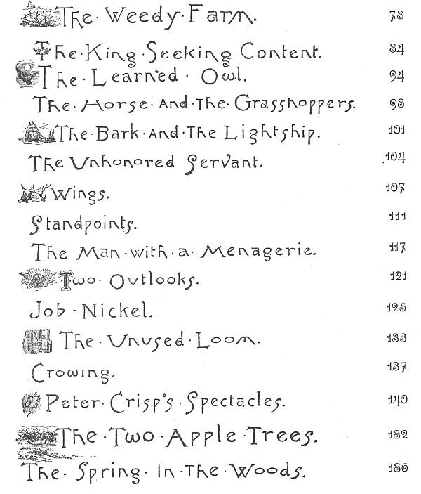 The writer of this volume does not claim to present in it a single new truth. In the sphere of morals, of which it treats, he believes there is no such thing. It is not new truths that we need, but the application of old ones to our daily life and practice. Any device that may assist in securing so desirable a result is of value; in the hope that these Fables may not be wholly useless to this end he hazards their publication. As their title indicates, they will be found to vary widely in subject and mode of treatment.