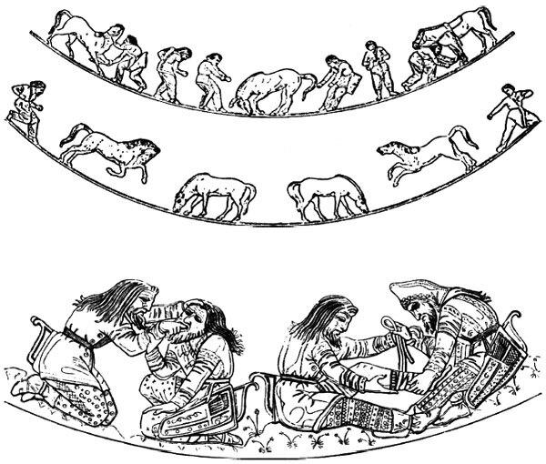 Особый интерес для нас представляет тесная связь, установившаяся между северными кочевниками и лошадьми. Известно, что с самых ранних времен лошади существовали в разных частях Древнего мира. Они определенно были известны вазовым художникам из Анау, людям из Триполья и людям из Северо-Западного Китая. Но для этих народов они оставались малосущественным приложением. С другой стороны, у северных кочевников лошадь играла важную роль, и распространение этих кочевников на другие регионы почти всегда связано с распространением лошадей и искусства верховой езды.