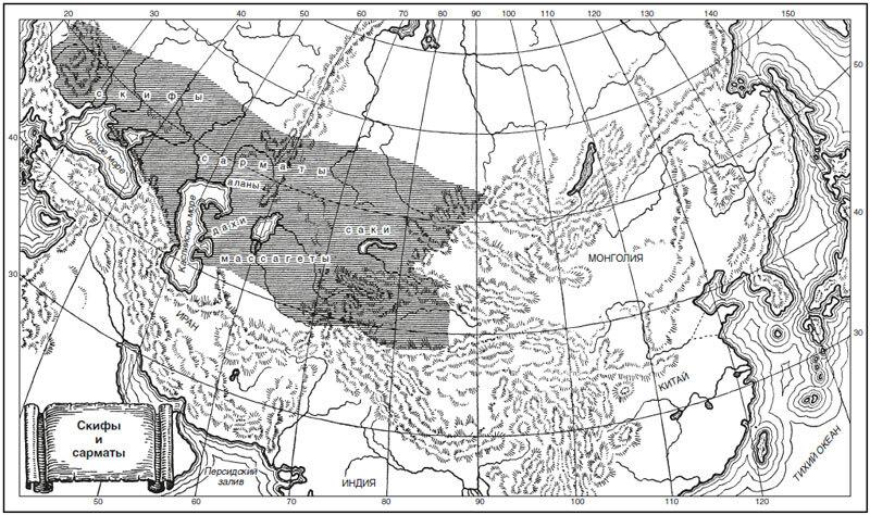 На протяжении этого исторического периода существовало резкое различие между Северным Туркестаном и Южным Туркестаном. Несмотря на то что люди, обитавшие в этих двух регионах, в целом произошли от одного корня и имели много общих культурных особенностей, теперь они считали друг друга не соплеменниками, а скорее ярыми соперниками и врагами. Северный Туркестан исторически и культурно был связан со степями Южной России, и большую часть имеющейся у нас информации о нем мы получили от греческих колонистов, обосновавшихся на северном побережье Черного моря. С другой стороны, Южный Туркестан был более тесно связан с Иранским нагорьем. Когда персам наконец удалось установить контроль над Иранским нагорьем, Южный Туркестан тоже вошел в состав Персидской империи, и в результате наша информация в отношении обитателей Южного Туркестана того периода во многом почерпнута из древних персидских надписей и от тех греков, которые интересовались историей Персии.