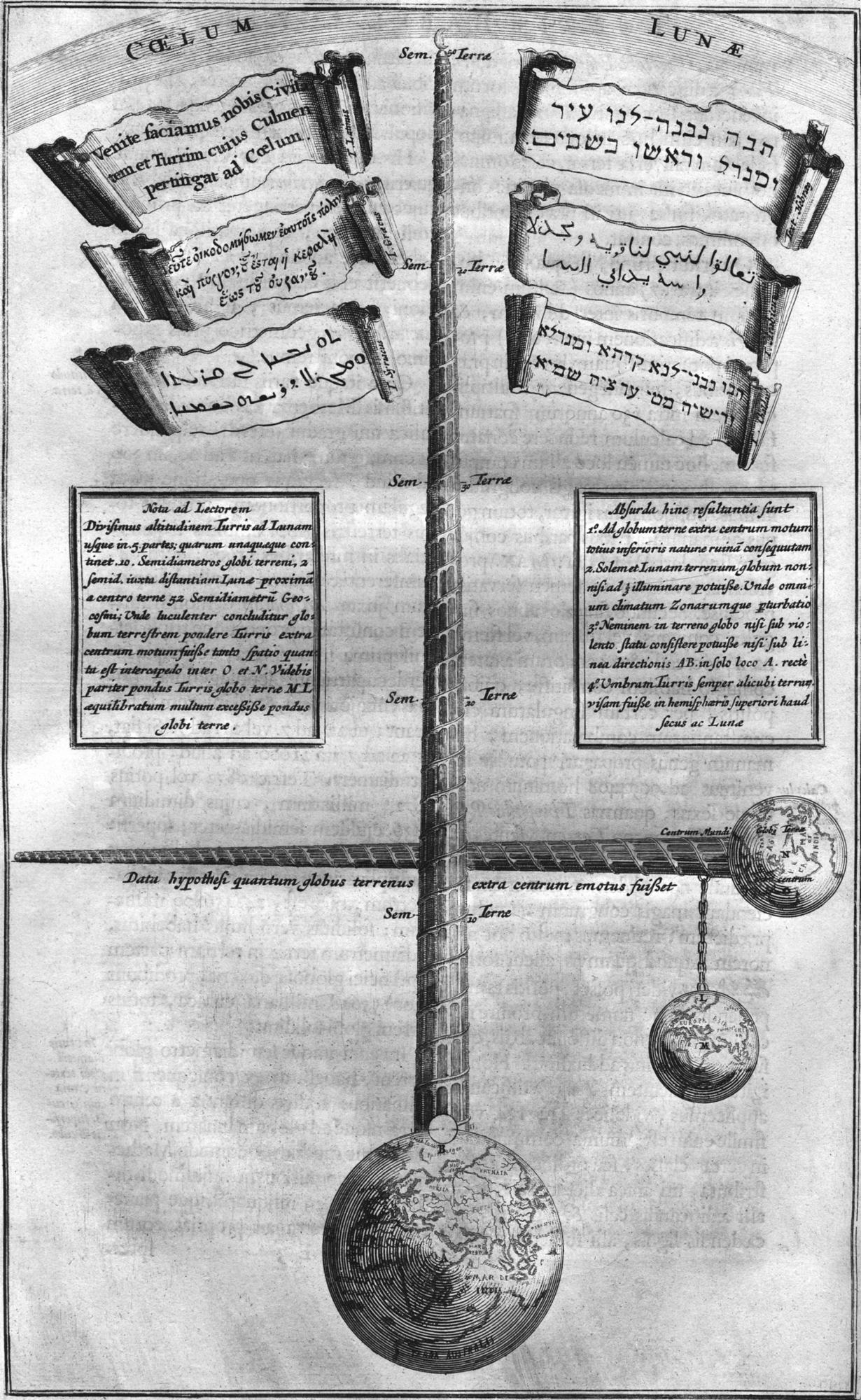 — У меня есть и другие. Но Кирхер — лучший. — Ксендз открывает наугад, и они разглядывают Землю, изображенную в виде шара с длинным тонким конусом Вавилонской башни. — Кирхер доказывает, что описанная в Библии Вавилонская башня не могла быть такой высокой, как ее рисуют. Башня, достигающая лунной сферы, нарушила бы космический порядок. Ей потребовалось бы огромное основание, опирающееся на земной шар. Оно заслонило бы солнце, что имело бы катастрофические последствия для всего живого. Людям пришлось бы израсходовать все имеющиеся на Земле запасы древесины и глины…