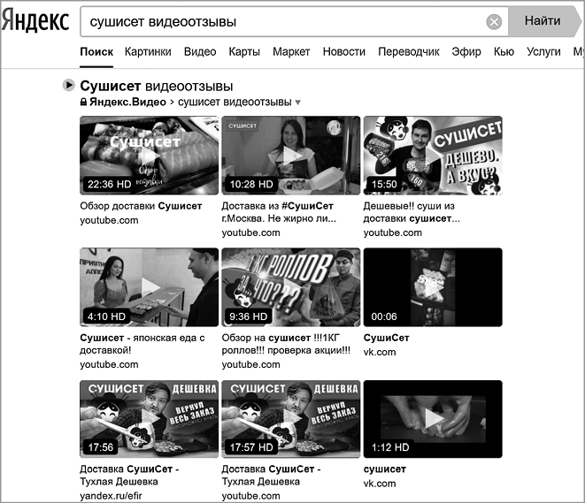 Рассмотрим примеры видеовыдачи для бренда ресторана азиатской кухни. Потенциальный клиент, который планирует заказать доставку еды из этого ресторана, часто хочет предварительно убедиться в ее качестве. Для этого он запрашивает в поисковике видеоотзывы о бренде. Несколько роликов из видеовыдачи носят явно негативный характер и способны оттолкнуть пользователя от заказа ещё до их просмотра.