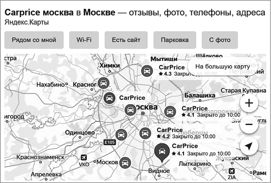 Предположим, что пользователь ищет сервис по продаже авто в своём городе. После ввода поискового запроса он сразу же вверху поисковой выдачи получает карту, на которой отмечены филиалы искомой организации. Важно отметить, что для некоторых точек на карте сразу отображаются их клиентские рейтинги, которые также могут повлиять на решение пользователя по выбору сервиса. Вот пример «колдунщика» Яндекс.Карт по геозапросу «carprice москва».