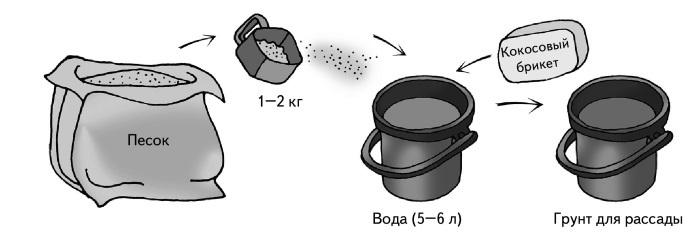 Приготовить смесь из брикета кокосового субстрата, 2 кг песка и 5–6 л воды. Вместо кокосового брикета можно взять ведро верхового торфа, половину ведра песка и литровую банку золы (из-за высокой кислотности торфа). Все хорошо перемешать и увлажнить. Вместо золы можно взять 1 стакан доломита или извести. Такая почва не меняет своего состава во время роста рассады, воздуха и влагопроницаема, имеет нейтральную реакцию (рис. 1).