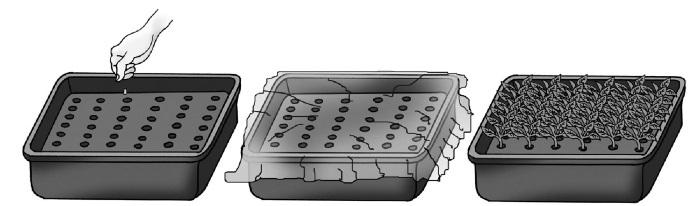 Емкость должна быть не очень глубокой (6–7 см высотой). Хорошо увлажненной почвенной смесью заполните емкость, не доходя до верхнего края 2 см. Уплотните почву столовой ложкой (рис. 2), добавьте почву, если нужно, снова уплотните и разложите семена по поверхности почвы на расстоянии 1 × 1 см. Насыпьте сверху сухую почву высотой 2 см и уплотните ложкой. Накройте емкость стеклом или пленкой и поставьте в теплое место (рис. 3).
