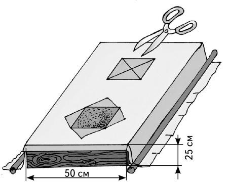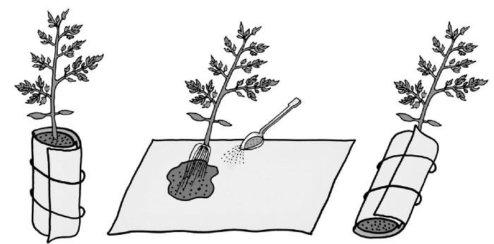 Пикировка рассады в «пеленки» из пленки при 2–3 настоящих листах. Нарежьте пленку размером 20 × 30 см. Маркером в левом верхнем углу напишите номер, под которым занесете название сорта в тетрадь или просто напишете название сорта. Переверните «пеленку». В левый верхний угол насыпьте 1 столовую ложку грунта, положите на него сеянец, у которого (вопреки всем рекомендациям) ни в коем случае не обрывайте кон чик корня: надо, чтобы он рос вниз, а не расползался под поверхностью во все стороны! Сверху насыпьте еще 1 ложку грунта и заверните «пеленку» (рис. 4). Составьте все пакетики в поддон, желательно такой же высоты, как пакетики, плотно друг к другу. При такой пикировке для рассады требуется мало места и мало почвы.