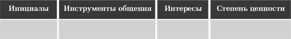 Возьмите пару листов бумаги и разделите каждый лист на четыре колонки. В первой записываются инициалы. Во второй — инструменты общения (личное общение, телефонные разговоры, социальные сети). В третьей колонке тезисно опишите интересы человека, систему ценностей. Последняя часть таблицы — поставьте условную степень ценности вашей связи.