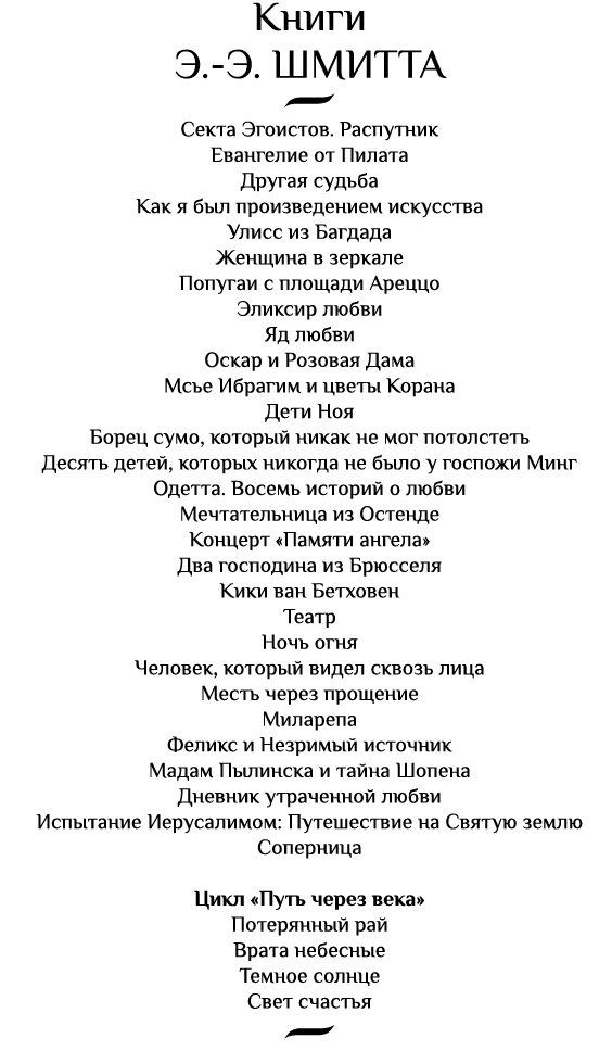 Эрик-Эмманюэль Шмитт — мировая знаменитость, лауреат Гонкуровской премии и многих других наград. Его роман «Оскар и Розовая Дама» читатели назвали книгой, изменившей их жизнь, наряду с Библией, «Маленьким принцем» и «Тремя мушкетерами». Его романы переведены на 45 языков и огромными тиражами выходят в более чем 50 странах. «Путь через века» — грандиозная философско-романтическая сага Шмитта, попытка охватить единым взглядом и осмыслить всю человеческую историю.