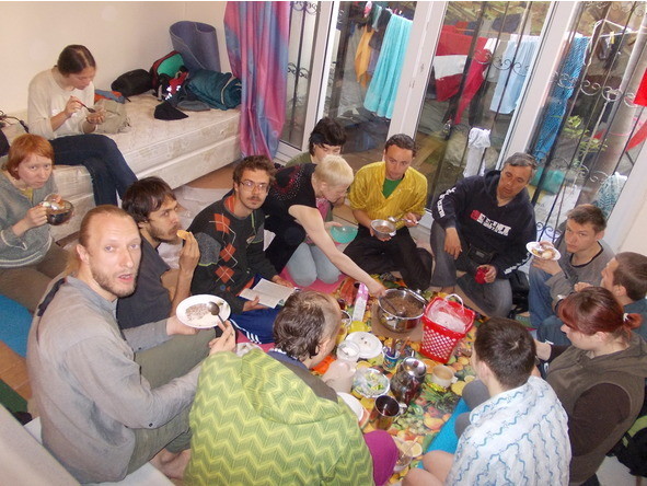 Живут все вместе в общих комнатах, спят на полу в собственных спальниках (кроватей на всех обычно не находится), всю приносимую еду делят и съедают вместе – такой коммунизм в отдельно взятом доме (квартире), возникающий в разных местах Земли, в заранее обговоренные сроки.