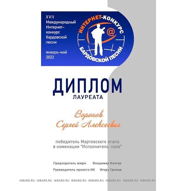 Здравствуйте! Безмерно рад нашему знакомству. Меня зовут Воронов Сергей, я родился в 1965 году и вырос в прекрасном городе Алма — Ата (Казахстан), по специальности я механик, а стихи (и не только) пишу для души. Являюсь поющим поэтом (бард), помимо книг выпускаю и CD с песнями на свои стихи. Являюсь дипломатом различных конкурсов авторской песни и особая гордость — лауреат Грушенского интернет конкурса 2022 года.