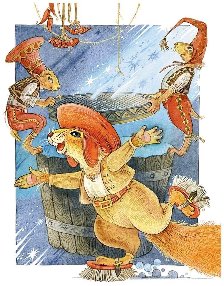 Тут она снова засвистела. Сначала появилось несколько морских свинок в передниках; за поясом у них торчали кухонные ложки и поварские ножи. За ними вприпрыжку прибежали белки в широких турецких шароварах[1] и зелёных бархатных шапочках. Они, по-видимому, были поварятами. Проворно лазили они на стены, доставали с них горшки и блюда, приносили яйца и масло, коренья и муку и всё это ставили на плиту. Старуха же в своих кокосовых скорлупках бегала по комнате, и мальчик видел, что она старается сварить ему что-то очень вкусное. Вот затрещал огонь, в горшке закипело, и приятный аромат разлился по комнате. Но старуха продолжала бегать туда и сюда, и каждый раз, проходя мимо плиты, совала свой длинный нос в горшок. Наконец кушанье закипело, пар густыми клубами повалил из горшка, и пена полилась на огонь.