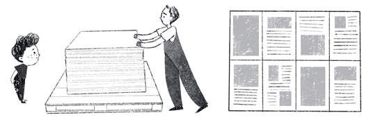 В типографии бумага для книг хранится в огромных рулонах. Их разматывают и нарезают на большие листы, которые называют печатными. На одном печатном листе помещается 4, 8, 16 или 32 страницы будущей книги.