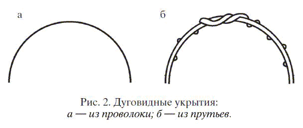 Из проволоки нарезают отрезки по 160–170 см, которые изгибают в виде дуг и концы заглубляют в землю. Расстояние между концами дуг должно быть 80 см, высота над землей – 45–50 см (рис. 2 а). Дуги устанавливают друг от друга на расстоянии 100 см и поверху связывают между собой шпагатом. По торцам гряд вбивают колышки, к которым привязывают шпагат, предварительно хорошо его натянув.