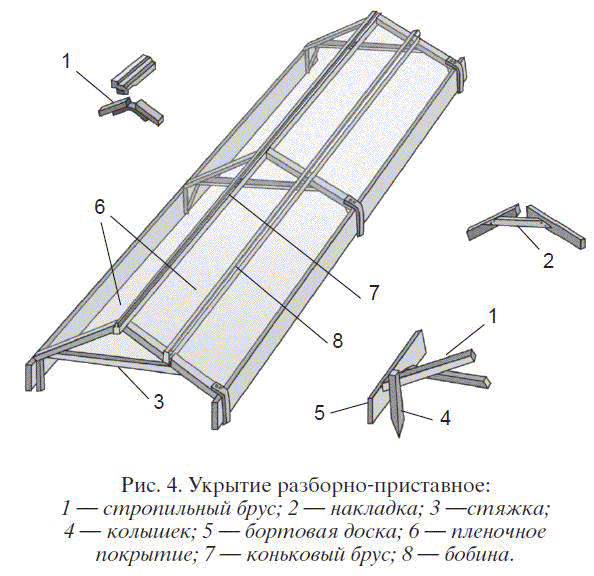 Разборно-переставной пленочный парник. Площадь парника при длине 6 м составляет 9,6 м² (рис. 4). Он собирается из трех стропильных рам, двух бортовых досок и пленочного покрытия. Сборку производят без крепежных деталей. Бортовые доски (при заводском изготовлении укрытий) вставляют в пазы металлических опор стропил. Затем каркас накрывают пленочным покрытием, собранным отдельно из конькового бруса, двух бобин и полотнища пленки шириной 2,3 м и длиной 7,6 м. Пленку прикрепляют к деталям деревянным штапиком, который заворачивают в край пленки (1–2 оборота). Бобина после сборки должна висеть, натягивая пленку собственной массой.
