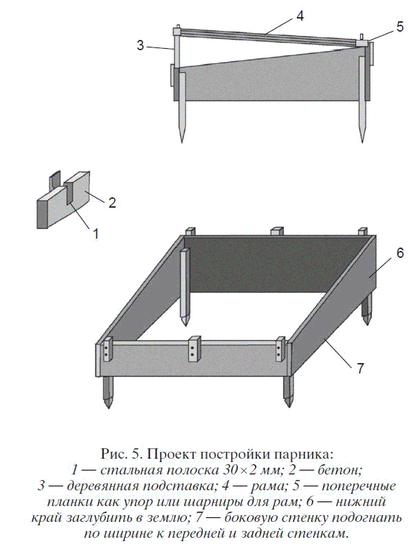 Северная сторона парника (северный парубень) должна быть выше южной на 10–12 см. У южного парубня (рис. 7) делают паз или прибивают рейки для упора рам. Северный парубень должен иметь вверху плоский срез под небольшим углом, обеспечивающим плотное прилегание рамы.