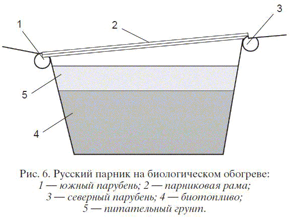 Русский односкатный парник (рис. 6). Его легко сделать своими силами. Вначале роют котлован глубиной 50–60 см, ширина его в верхней части 145–150 см, внизу – 120 см. Направление котлована – с запада на восток. По краям его кладут обвязку (опору для парниковых рам) из бревен диаметром 13–15 см или досок толщиной 4–5 см. Длина обвязки будет зависеть от количества парниковых рам.