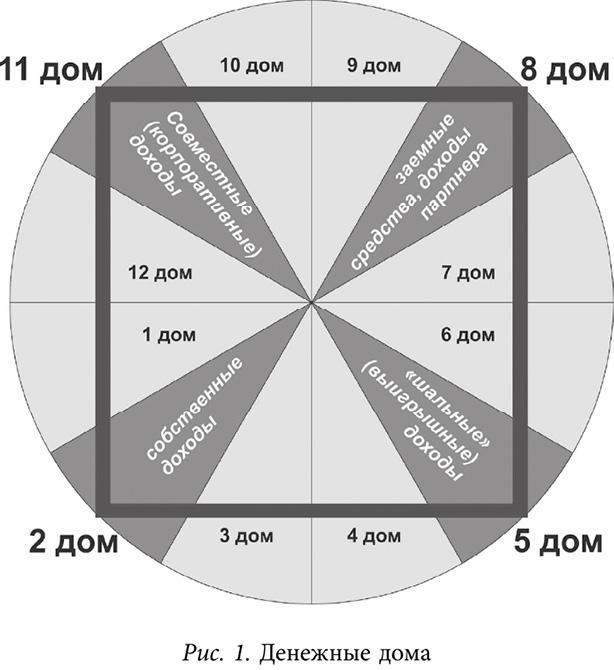 Домами денег и доходов в астрологии являются 2-й, 5-й, 8-й, 11-й. Четыре дома соответствуют четырем источникам дохода у любого человека-предпринимателя или организации.