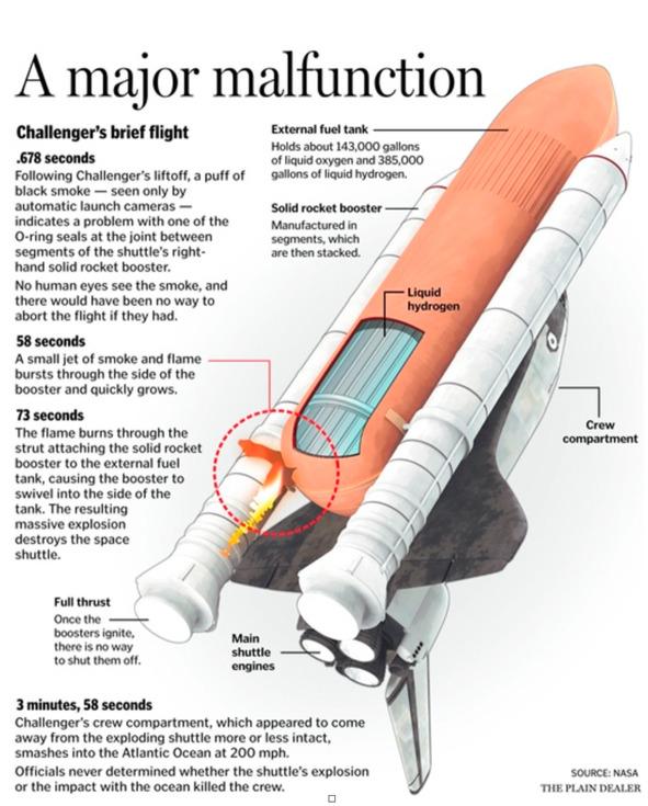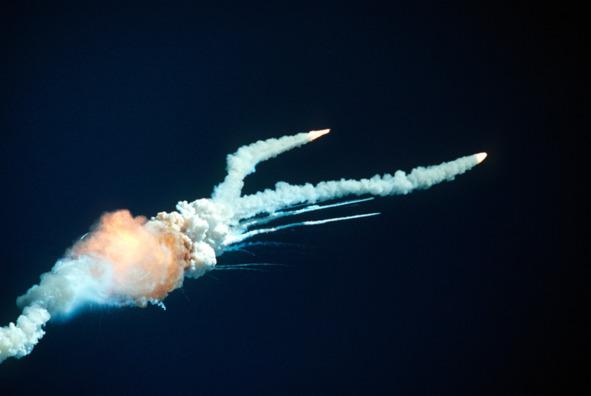 Что же стало причиной трагедии «Челленджера»? Конструкторский просчет. Проблемной деталью были резиновые кольца, герметизирующие швы деталей боковых ускорителей. Во время запуска шаттла одно из таких колец вблизи соединения с внешним топливным баком разрушилось. В баке находятся кислород и водород в жидком виде, и когда он разрушился, вещества смешались, и произошел взрыв. Хотя проблема была еще на стартовом столе, при начале работы двигателей стык сегментов разгерметизировался, открыв путь горящим газам вовне. Из-за холодной погоды резиновое кольцо уплотнения уже не было эластичным и не обеспечило изоляцию, как в предыдущих запусках. Утечка прожгла место соединения ускорителя и топливного бака. У шаттла был шанс пережить запуск, потому что продукты горения топлива закупорили пробоину, но сильный порыв ветра выбил пробку, и газ начал бить во внешний топливный бак, пробив его стенку. Никто из персонала не заметил, что работа двигателей изменилась. Когда двигатели включились на полную мощность в верхних слоях атмосферы, ускоритель провернулся на верхнем креплении, ударил по баку, и его содержимое воспламенилось. Сам шаттл разрушился не от огня, а от колоссальных перегрузок в 20 атмосфер, в 4 раза превышающих максимально допустимое значение. Шаттл буквально разорвало, а твердотопливные ускорители продолжили лететь сами по себе.