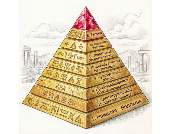 1. Наивная / Ведомая. 2. Адаптирующаяся / Исполнительница. 3. Пробуждающаяся / Сомневающаяся. 4. Чувственная / Живая. 5. Индивидуалистка / Независимая. 6. Защитница / Хранительница. 7. Исследователь / Ученица. 8. Творец. 9. Целостная / Мудрая (Лилит).