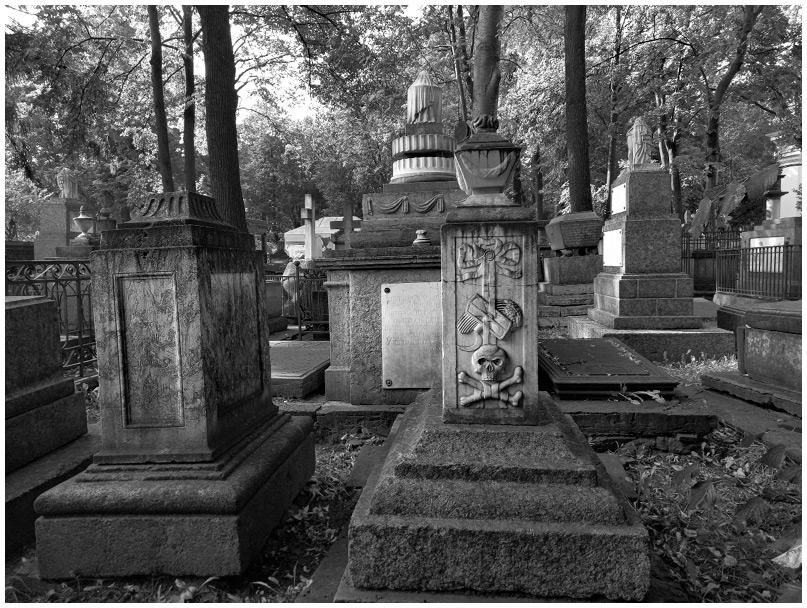представляет собой небольшой путеводитель по некрополям Петербурга. В него вошли несколько самых любопытных, на наш взгляд, кладбищ и даны общие рекомендации к тому, что можно на них увидеть. Предполагается, что в процессе чтения читатель сам определит интересующие его вопросы и сможет выбрать некрополи, которые захочет посетить. Или не выбрать ни один — мы не настаиваем!