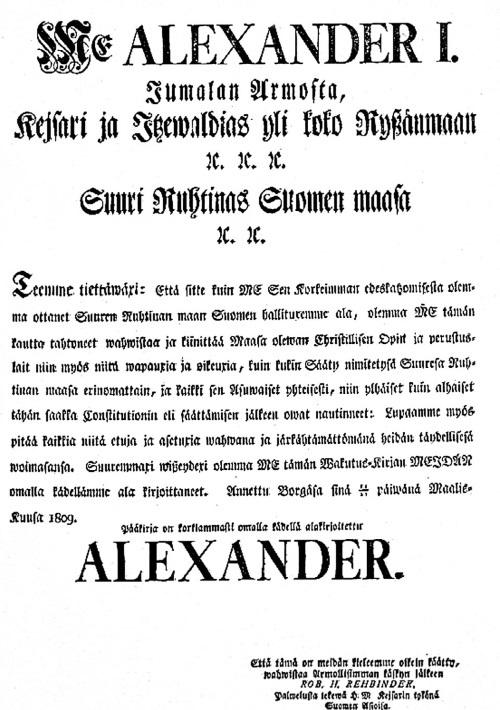 «Из деклараций, в свое время изданных, известны праведные уважения, подвигнувшие нас к разрыву с Швецией и к введению войск Наших в Шведскую Финляндию. Безопасность Отечества Нашего взыскивала от нас сея меры.
