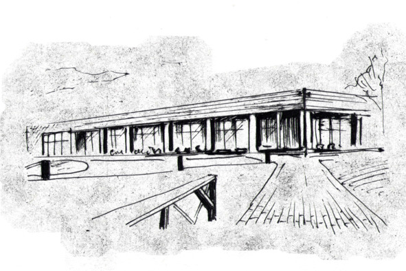 Чтобы не отвлекать внимание зрителей от самого поля, архитектурный комплекс «убран» в ландшафт. Холм-курган белого камня, из которого выступает смотровая площадка, разведен в два здания, сходящиеся углами на импровизированной площади.