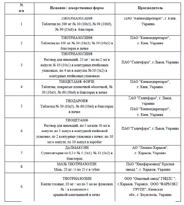1994 год стал рубиконом для препарата «Тиотриазолин». После успешного завершения проведения II-й стадии клинических испытаний препарат «Тиотриазолин» был разрешен МЗ Украины к медицинскому применению. Тиотриазолин стал первым отечественным украинским оригинальным лекарственным препаратом. От момента синтеза фармацевтами университета субстанции до клинического внедрения «Тиотриазолина» как лекарственного препарата прошло более 10 лет. Руководство АО «Галичфарм» первым поверило в препарат и в 1994 году наладило промышленный выпуск инъекционных растворов и таблеток «Тиотриазолина». В настоящее время отечественными производителями выпускается субстанция тиотриазолина и его лекарственные формы: таблетки, инъекционные растворы, мазь, суппозитории, глазные капли и комплексные препараты — инъекционный раствор и таблетки «Тиоцетам» и «Тиодарон». Производство субстанции тиотриазолина и его лекарственных форм налажено такими фармацевтическими заводами, как АО «Галичфарм» (инъекционный раствор 1 % и 2,5 %, таблетки по 0,1 и 0,2 г); АО «Красная звезда», г. Харьков (мазь 2 %); «Завод Реактив» (субстанция); «Опытный завод ГНЦЛС» (глазные капли); ЗАО «Лекхим», г. Харьков (суппозитории по 0,2 г); АО «Галичфарм» (таблетки «Тиоцетам»), корпорация «Артериум» (таблетки по 0,1 г и 0,2 г тиотриазолина, тиоцетама и тиодарона), что представлено в табл.1.1.